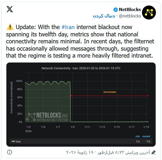 ایران اینترنشنال: نتبلاکس، نهاد مستقل پایش وضعیت اینترنت، هشدار داد حکومت ایران در پی تشدید محدودیتهای ارتباطی از طریق پروژه «اینترانت» است. پیشتر ایراناینترنشنال گزارشی درباره تلاش جمهوری اسلامی برای راهاندازی پروژهای جدید با هدف قطع طولانیمدت اینترنت منتشر کرده بود.در ۲۴ ساعت گذشته، برخی کاربران از دسترسی کوتاه و منقطع به اینترنت در برخی نقاط ایران خبر دادهاند. با این حال، نتبلاکس دوشنبه ۲۹ دی با انتشار پیامی در ایکس، به گذشت ۱۲ روز از قطع اینترنت در ایران اشاره کرد و نوشت میزان اتصال سراسری «همچنان حداقلی باقی مانده است».