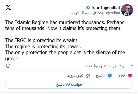 تام توگِندهات، نماینده پارلمان بریتانیا و وزیر سابق امنیت این کشور، در واکنش به اظهارات عباس عراقچی، وزیر امور خارجه جمهوری اسلامی که کشتار معترضان را به موساد نسبت داده بود، نوشت: «رژیم اسلامی هزاران نفر [از مردم خود] را به قتل رسانده است. شاید دهها هزار نفر. حالا ادعا میکند که از آنها محافظت میکند. رژیم در واقع دارد از قدرت خود محافظت میکند.»