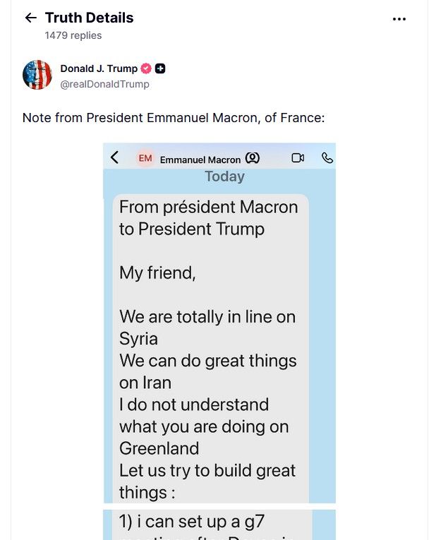 رئیس جمهوری ایالات متحده با انتشار این پیامک، در واقع تلاش کرد تا همتای فرانسوی خود را آچمز کند. او با این کار به هوادارانش نشان داد که رهبران اروپا برای جلب نظر او در مورد موضوعات مختلف به ویژه گرینلند «صف کشیدهاند.»