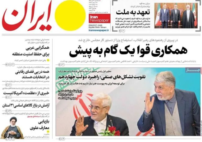 روزنامه ایران، ارگان رسمی دولت جمهوری اسلامی در شماره امروز عمدتا خبرهای دولتی را منتشر کرده و درباره وقایع مربوط به سرکوب اعتراضات اخیر، گزارشی در صفحه اول خود ندارد.