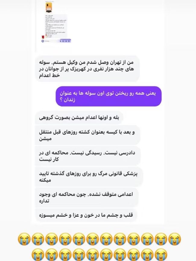 این وکیل نوشته: «دادرسی نیست، رسیدگی نیست، محاکمهای در کار نیست. پزشکی قانونی مرگ آنها را برای روزهای گذشته تایید میکند. اعدامها متوقف نشدهاست، چون محاکمهای وجود ندارد. قلب و چشم ما در خون، عزا و خشم میسوزد.»