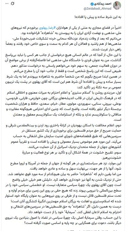 شرط احمد زیدآبادی برای پیوستن به شاهزاده رضا پهلوی:«حمایت صریح از حق مردم فلسطین»!