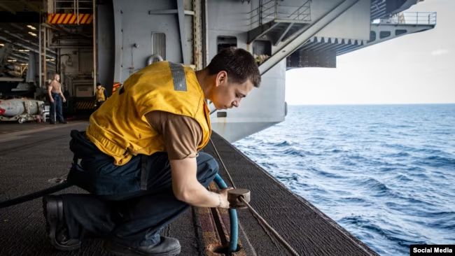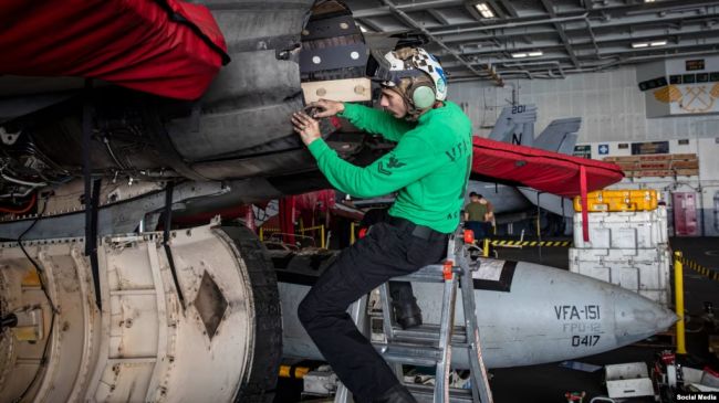 یک خدمه ناو هواپیمابر آبراهام لینکلن، مشغول عملیات تعمیر و نگهداری دورهای یک جنگندهرادیو فردا: فرماندهی مرکزی نیروهای مسلح ایالات متحده در خاورمیانه، «سنتکام»، عصر دوشنبه ششم بهمنماه با انتشار دو عکس از داخل ناو هواپیمابر آبراهام لینکلن، از حضور این ناو و گروه ضربت همراهش در اقیانوس هند و در منطقه عملیاتی سنتکام، شامل خاورمیانه و ایران خبر داد.در تصاویری که سنتکام از این ناو هواپیمابر منتشر کرده، دو تن از خدمه در حال انجام وظایف معمول تعمیر و نگهداری دیده میشوند. سنتکام در توضیح این عکسها، ضمن تأکید بر اعزام شدن این ناوگروه به منطقه خاورمیانه، هدف از آن را، «ارتقای امنیت و ثبات منطقهای» اعلام کرده است.