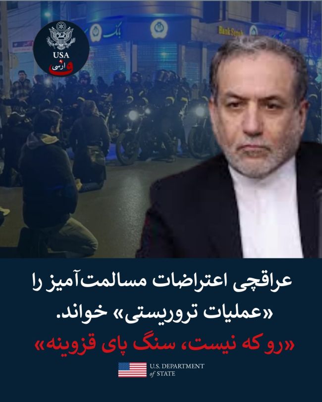 حساب فارسی وزارت خارجه آمریکا در اکس:اخیراً وزیر امور خارجه ایران، عراقچی، در شبکههای اجتماعی اعتراضات مسالمتآمیز را «عملیات تروریستی» خواند.