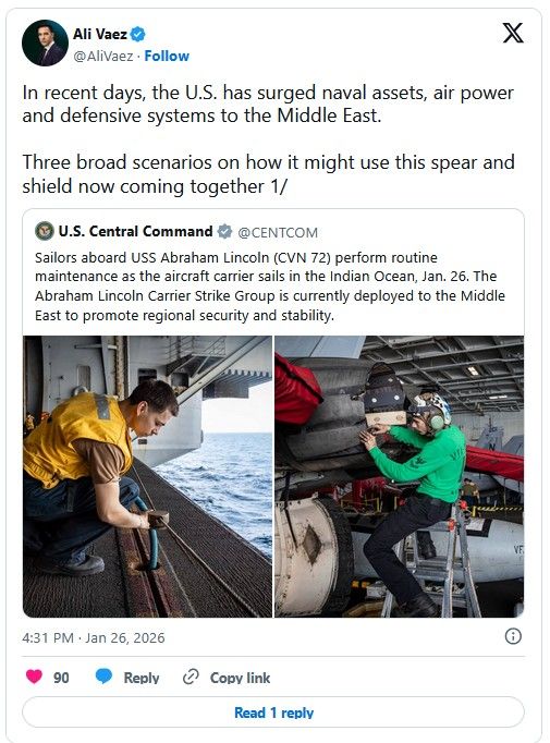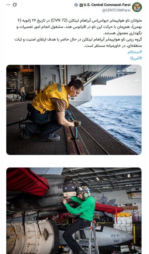 ستاد فرماندهی مرکزی ایالات متحده (سنتکام) روز دوشنبه تایید کرد که ناو هواپیمابر «یواساس آبراهام لینکلن» در خاورمیانه مستقر شده است. علاوه بر این ناو هواپیمابر و گروه رزمی همراه آن، شامل سه کشتی جنگی مجهز به موشکهای کروز «تاماهاوک»، ایالات متحده بیش از ۱۰ جنگنده اف-۱۵ را نیز به پایگاههای مختلف در منطقه اعزام کرده است. همچنین بنابر گزارشها، چندین هواپیمای جنگی و سوخترسان آمریکایی در پایگاههای مختلف ایالات متحده در منطقه خاورمیانه و مدیترانه مستقر شدهاند.