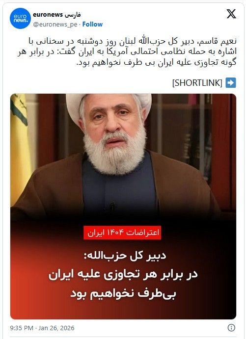 نعیم قاسم، دبیرکل حزبالله لبنان روز دوشنبه در سخنانی با اشاره به حمله نظامی احتمالی آمریکا به ایران گفت: «در برابر هر گونه تجاوزی علیه ایران بیطرف نخواهیم بود.»