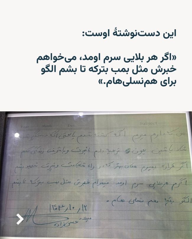 میلاد در وصیتنامه کوتاهش نوشته بود: «اگر کشته شدم یا اگر دستگیر شدم شاد باشین. چون ترجیح دادم با غیرت و با شرف زندگی کنم.» این نوجوان معترض در این یادداشت با لحنی خودمانی افزوده بود: «اگر قراره بمیرم همان بهتر که در راه شجاعت و غیرت شهید بشم. اگر هم هر بلایی سرم اومد میخوام خبرش مثل بمب بترکه، تا بشم الگوی بقیه همنسلیهام.»