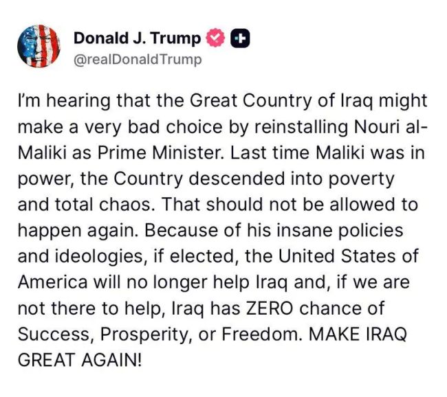 ترامپ همچنین هشدار داد که اگر المالکی مجددا به نخستوزیری گماشته شود ایالات متحده آمریکا به عراق هیچ کمکی نخواهد کرد.