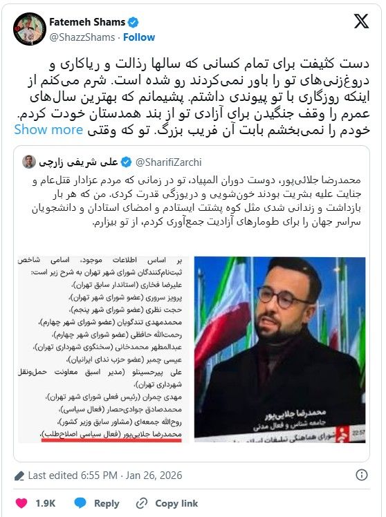 پیام فاطمه شمس در شبکه اکس:دست کثیفت برای تمام کسانی که سالها رذالت و ریاکاری و دروغزنیهای تو را باور نمیکردند رو شده است.