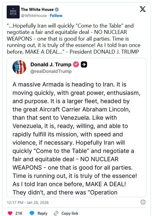 رئیسجمهور آمریکا در پست امروز خود در شبکههای اجتماعی، به اعزام ناو هواپیمابر آبراهام لینکلن به سمت ایران اشاره کرد و گفت که این ناو و گروه ضربت همراهش، «آماده» و «قادر» است که در صورت لزوم «با سرعت و خشونت» ماموریتش را اجرا کند.