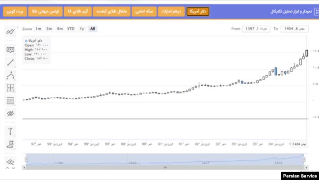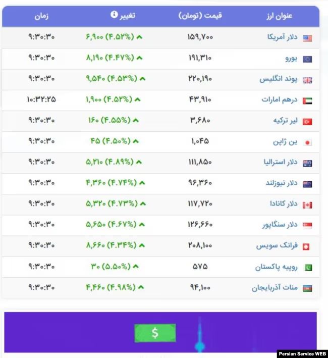 صدای آمریکا: با ادامه روند سقوط آزاد و سریع ارزش واحد پول ملی در ایران، روز چهارشنبه نرخ برابری ارزهای خارجی در بازارهای ایران رکورد تازهای بر جا گذاشت، به طوری که نرخ دلار در زمان تنظیم این خبر در آستانه رکورد تاریخی ۱۶۰ هزار تومان قرار گرفته است.بر اساس اطلاعات مندرج در سایت «نوسان» که نرخ لحظهای ارز و مسکوک را در بازار ایران ارائه میدهد، در تابلوهای نرخگیری (تا لحظه تنظیم این خبر) چهار ارز پرمعامله با اعداد سنگینتری دیده میشوند: دلار آمریکا ۱۵۹۷۰۰ تومان، یورو ۱۹۱۳۱۰ تومان، پوند ۲۲۰۱۹۰ تومان، و درهم امارات ۴۳۹۱۰ تومان. همزمان در بازار طلا و سکه هم تصویر مشابهی ثبت شده است: هر گرم طلای ۱۸ عیار به بیش از ۲۰ میلیون و ۲۰۰ هزار تومان و قیمت هر قطعه تمام سکه موسوم به طرح امامی به ۲۰۴ میلیون تومان رسیده است.