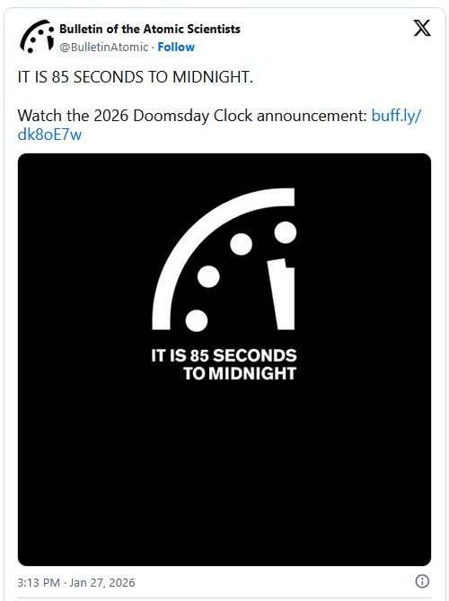 ساعت آخرالزمان روی ۸۵ ثانیه به نیمهشب تنظیم شد