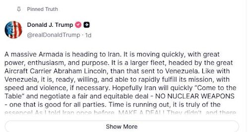 دونالد ترامپ، رئیسجمهوری ایالات متحده در اقدامی معنادار که نشاندهنده اولویت مطلق پرونده ایران برای کاخ سفید است، پیام تهدیدآمیز اخیر خود را در بالای صفحه حساب کاربریاش در شبکه اجتماعی «تروث سوشال» سنجاق کرد.