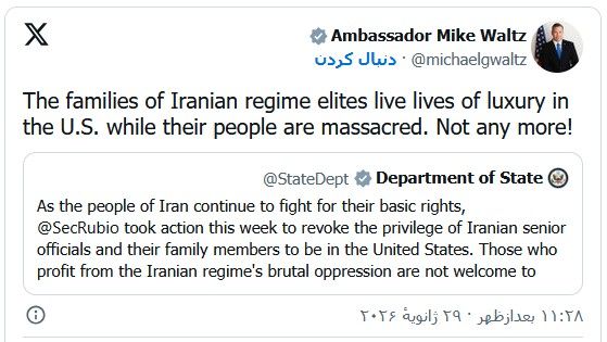 مایک والتز، نماینده ایالات متحده در سازمان ملل متحد، پست وزارت خارجه این کشور مبنی بر لغو امتیاز حضور مقامهای ارشد جمهوری اسلامی و خانوادههایشان در آمریکا در شبکه اجتماعی ایکس را بازنشر کرد و نوشت: «در حالی که مردم ایران قتلعام میشوند، خانواده نخبگان رژیم ایران در آمریکا زندگی لوکس و مرفهی دارند. دیگر کافی است؛ این وضعیت ادامه نخواهد داشت!»
