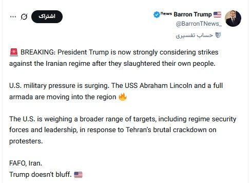 بارون ترامپ، فرزند رئیسجمهور آمریکا، با بازنشر خبری فوری از شبکه فاکسنیوز در حساب کاربری خود در ایکس، بر جدیت و قریبالوقوع بودن تهدیدات نظامی علیه تهران صحه گذاشت.