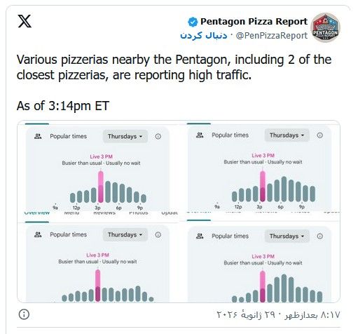 بر اساس آخرین گزارش حساب «Pentagon Pizza Report»، در شبکه اجتماعی ایکس، سطح سفارشهای پیتزا و ترافیک در رستورانهای اطراف ساختمان پنتاگون و وزارت دفاع آمریکا در ساعات بامدادی امروز به طرز چشمگیری افزایش یافته است. این شاخص که از دادههای زنده ترافیک گوگل استفاده میکند، نشان میدهد که پیتزافروشیهای نزدیک پنتاگون شاهد افزایشی بین ۲۰۰ تا حتی ۱۰۰۰ درصد فراتر از حد معمول بودهاند.