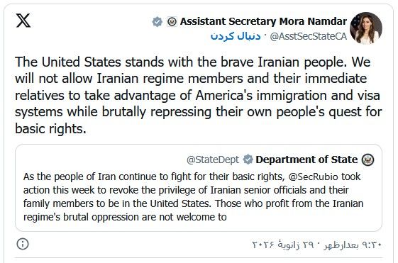 مورا نامدار، دستیار وزیر خارجه آمریکا در امور کنسولی، میگوید ایالات متحده اجازه نخواهد داد اعضای رژیم جمهوری اسلامی از ویزای آمریکا سوءاستفاده کنند.خانم نامدار با بازنشر دستور اخیر مارکو روبیو برای لغو امتیاز حضور مقامات جمهوری اسلامی در آمریکا نوشت: ایالات متحده در کنار مردم شجاع ایران ایستاده است. ما اجازه نخواهیم داد اعضای رژیم جمهوری اسلامی و بستگان درجهیک آنها، که بهطور بیرحمانه خواست مردم خود برای حقوق ابتدایی را سرکوب میکنند، از مزایای نظامهای مهاجرتی و ویزای آمریکا سوءاستفاده کنند.