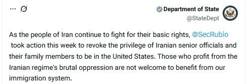 در بخشی از پیام وزارت خارجه آمریکا در این باره آمده است: «کسانی که از سرکوب وحشیانه رژیم ایران سود میبرند، اجازه ندارند از نظام مهاجرتی ما منتفع شوند.»