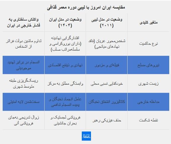 یورونیوز: تصاویر این روزهای ایران، در نگاه اول هر چند دلهرهآور است ولی برای تحلیلگران آشناست: جامعه ملتهب، فریادهای اعتراض، سایه سنگین فقر بر سفرهها و صدای مداوم طبل جنگ در رسانههای بینالمللی. برای بسیاری، این صحنهها تکرار نعلبهنعل روزهای پیش از سقوط حکومت معمر قذافی در لیبی است.ایران امروز، در میانه یک «طوفان سنگین» ایستاده است. از یک سو، بزرگترین اعتراضات دهههای اخیر بدنه اجتماعی را تکان داده و از سوی دیگر، بحران اقتصادی چنان عمیق شده که کمر طبقه متوسط را شکسته است. در میان این شکافهای عمیق، تهدیدهای نظامی و سایه سنگین تحریم، سوالی را در ذهن هر ایرانی ایجاد کرده است: «آیا قرار است لیبی دیگری شویم؟»