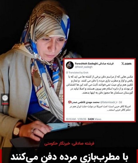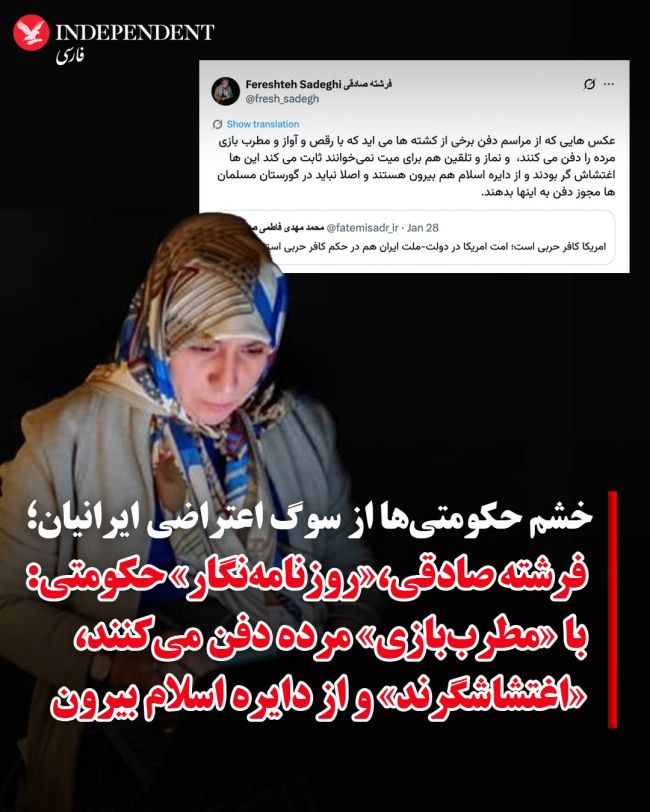 خشم حکومتی ها از سوگ اعتراض ایرانیان؛ فرشته صادقی روزنامه نگار حکومتی: با ««مطرببازی« مرده دفن میکنند، «اغتشاشگرند»و از دایره اسلام بیرونفرشته صادقی،«روزنامهنگار» حکومتی با سابقه همکاری با پرستیوی و الجزیره، سوگ اعتراضی مردم ایران در خاکسپاری جاویدنامان کشته شده به دست عوامل جمهوری اسلامی را «مطرببازی» خواند و در همصدایی با حکومتی که دهها هزار ایرانی را به خاک و خون کشیده، مدعی شد «همین ثابت میکند اینها اغتشاشگر بودند و از دایره اسلام بیرون هستند.» این چهره حکومتی افزود: «اصلا نباید در گورستان مسلمانها مجوز دفن به اینها بدهند.»