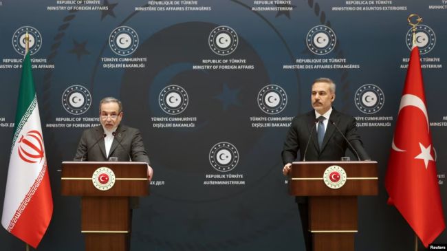 از راست: هاکان فیدان و عباس عراقچی وزرای خارجه ترکیه و ایرانرادیو فردا: وزیر خارجه جمهوری اسلامی روز جمعه ۱۰ بهمن در استانبول گفت تهران آماده ازسرگیری مذاکرات با آمریکا است، اما تأکید کرد ایران حاضر نیست بر سر مسائل دفاعی و موشکی گفتوگو کند.این در حالی است که رئیسجمهور ترکیه برای میانجیگری بین ایران و ایالات متحده اعلام آمادگی کرده است.