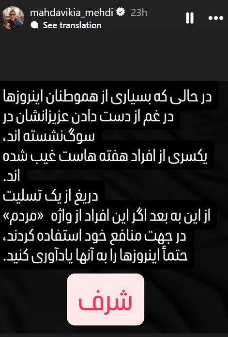 مهدی مهدویکیا: یکسری از افراد هفتههاست غیب شدهاند. دریغ از یک تسلیت