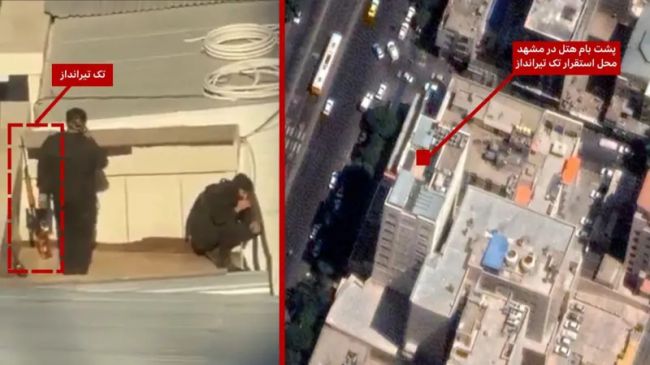 اسکرینشات از ویدیوی تک تیراندازها در مشهد و موقعیت آنها بر روی نقشه، جمعه ۱۹ دی - عکس: مملکتهآرم نظامی روی یونیفرم سیاه این دو نفر مشخص نیست. برای همین نمیتوان با قطعیت گفت که آنها نیروهای کدام نهاد نظامی هستند. نیروهای نوپو (نیروهای ویژه پیرو ولایت) زیر مجموعه فراجا و برخی از یگانهای سپاه پاسداران یونفرمهای سیاه دارند که از سلاح تکتیرانداز دراگونوف هم استفاده میکنند.