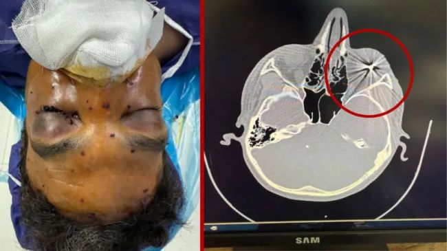 تصویر سیتیاسکن یکی از معترضان فرو رفتن گلوله ساچمهای در بافت چشم را به وضوح نشان میدهد. بیبیسی به دلیل محافظت از این افراد از افشای هویت آنها خودداری میکند.