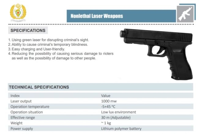 استفاده نیروهای امنیتی از لیزر سبز در اعتراضات دیماهنیروهای مسلح ایران نوعی لیزر سبز که شبیه به سلاح کمری است را در اختیار دارند که برای از بردن موقت دید مورد استفاده قرار میگیرد. اما مشخص نیست لیزر سبزی که در برخی ویدیوها دیده میشود، همین است یا نه.
