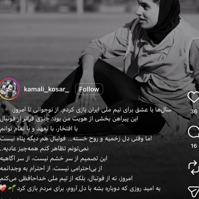 کوثر کمالی، بازیکن تیم فوتبال سنگینماشین ایستا، نیز در پیامی مشابه اعلام کرد سالها با عشق برای تیم ملی ایران بازی کرده و این پیراهن بخشی از هویت او بوده است. او نوشت زمانی که «دل زخمی و روح خسته است»، فوتبال دیگر نمیتواند پناهگاه باشد.