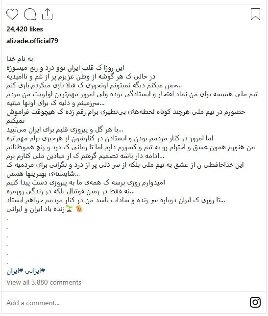 این بازیکن با اشاره به تجربه کوتاه خود در تیم ملی تاکید کرد لحظههای حضور در این تیم را فراموش نخواهد کرد و هر گل و پیروزی برایش به معنای تپیدن قلب برای ایران بوده است. علیزاده در عین حال تصمیم خود را «خداحافظی از سر عشق به مردم» دانست و اعلام کرد تا زمانی که رنج شهروندان ادامه دارد، در میادین ملی حضور نخواهد داشت.