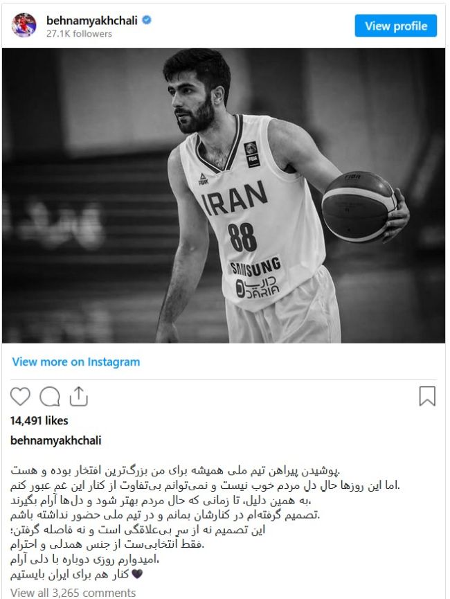 بهنام یخچالی، ملیپوش تیم بسکتبال ایران، در پستی اینستاگرامی نوشت پوشیدن پیراهن تیم ملی همواره بزرگترین افتخار او بوده است، اما در شرایطی که «حال دل مردم خوب نیست»، نمیتواند بیتفاوت بماند. او اعلام کرد تا زمانی که وضعیت مردم بهتر شود و «دلها آرام بگیرند»، در تیم ملی حضور نخواهد داشت. یخچالی تاکید کرد این تصمیم نه از سر بیعلاقگی، بلکه «انتخابی از جنس همدلی و احترام» است و ابراز امیدواری کرد روزی دوباره با آرامش برای ایران بازی کند.