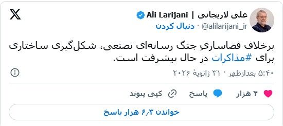 -علی لاریجانی دبیر شورایعالی امنیت جمهوری اسلامی که به دلیل دخالت در سرکوب مردم ایران در فهرست تحریمهای وزارت خزانهداری آمریکا قرار گرفت ۱۱ بهمن ۱۴۰۴ در «ایکس» نوشت «برخلاف فضاسازیِ جنگ رسانهای تصنعی، شکلگیری ساختاری برای مذاکرات در حال پیشرفت است.»