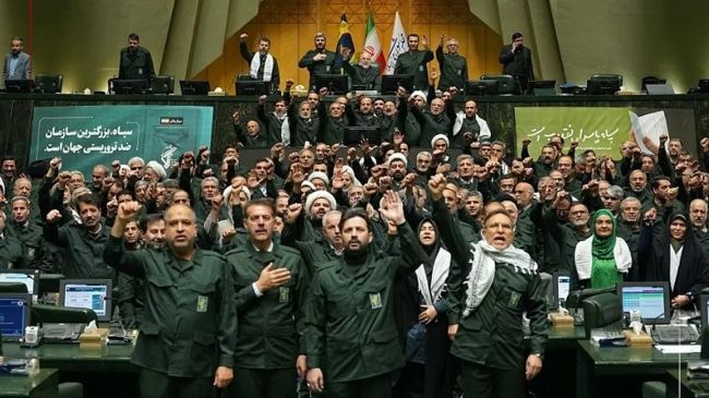نمایندگان مجلس در ایران در نشست علنی امروز در اقدامی اعتراضی و در واکنش به قرار گرفتن نام سپاه پاسداران در فهرست سازمانهای تروریستی اتحادیه اروپا، با لباس رسمی سپاه در صحن مجلس حاضر شدند.