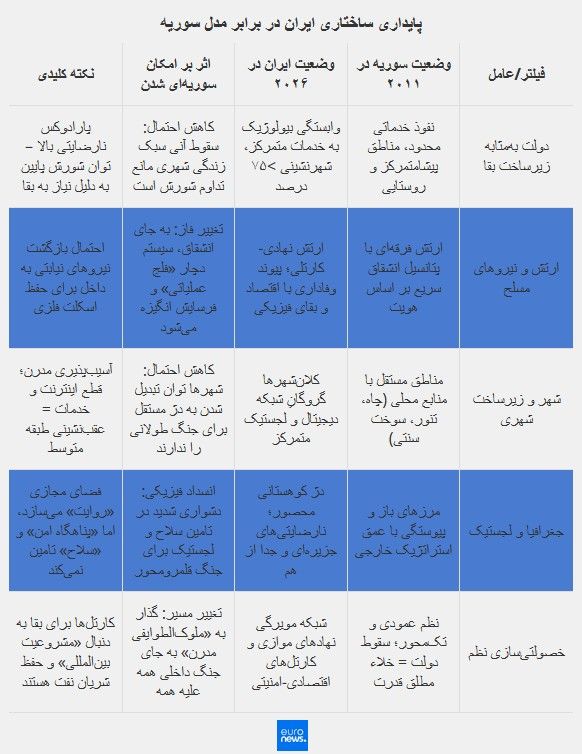در سوریه، قدرت مانند یک «ردای واحد» بود که با افتادن از دوش دولت، روی زمین ماند؛ اما در ایران، قدرت یک شبکه مویرگی است که حتی بدون مرکزیت واحد، میتواند در قالبهای کوچکتر بازتولید شود.