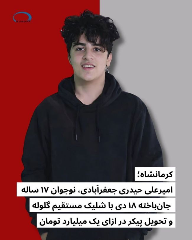 نوجوان دیگری به نام امیرعلی حیدری، چند روز مانده به تولد ۱۸ سالگیاش، در کرمانشاه در اعتراضها شرکت کرد. به گفته یک خویشاوند پس از گریز از کشور که شاهد قتل امیرعلی بوده است، نیروهای امنیتی جمهوری اسلامی ابتدا به سینه او شلیک کردند و سپس با قنداق تفنگ امیرعلی را تا سر حد مرگ زدند.