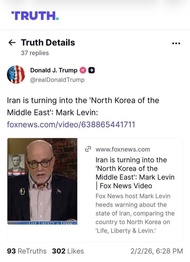 دونالد ترامپ، رئیس جمهوری ایالات متحده روز دوشنبه ۱۳ بهمنماه مصاحبه مارک لوین، وکیل مدافع و نظریهپرداز محافظهکار آمریکایی با فاکس نیوز درباره ایران را در شبکه تروث سوشال بازنشر کرد.