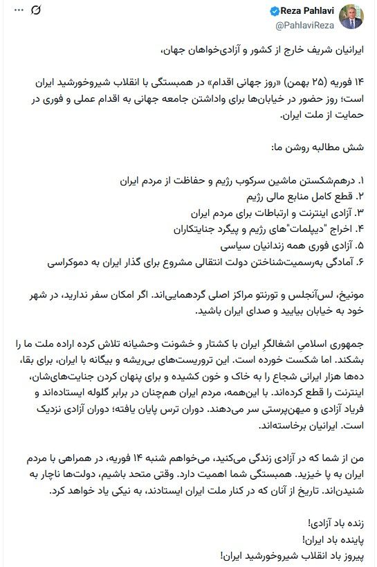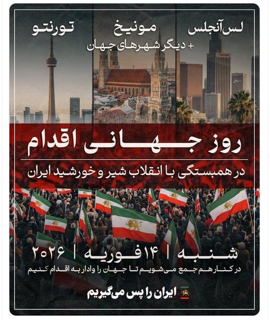 شاهزاده رضا پهلوی فراخوانی بهعنوان «روز جهانی اقدام در همبستگی با انقلاب شیر و خورشید» منتشر کرده و از ایرانیان در سراسر جهان خواسته است که روز شنبه ۲۵ بهمن برابر با ۱۴ فوریه دست به تظاهرات بزنند تا جهان را وادار به اقدام برای حمایت از مردم ایران در مقابل جمهوری اسلامی کنند.