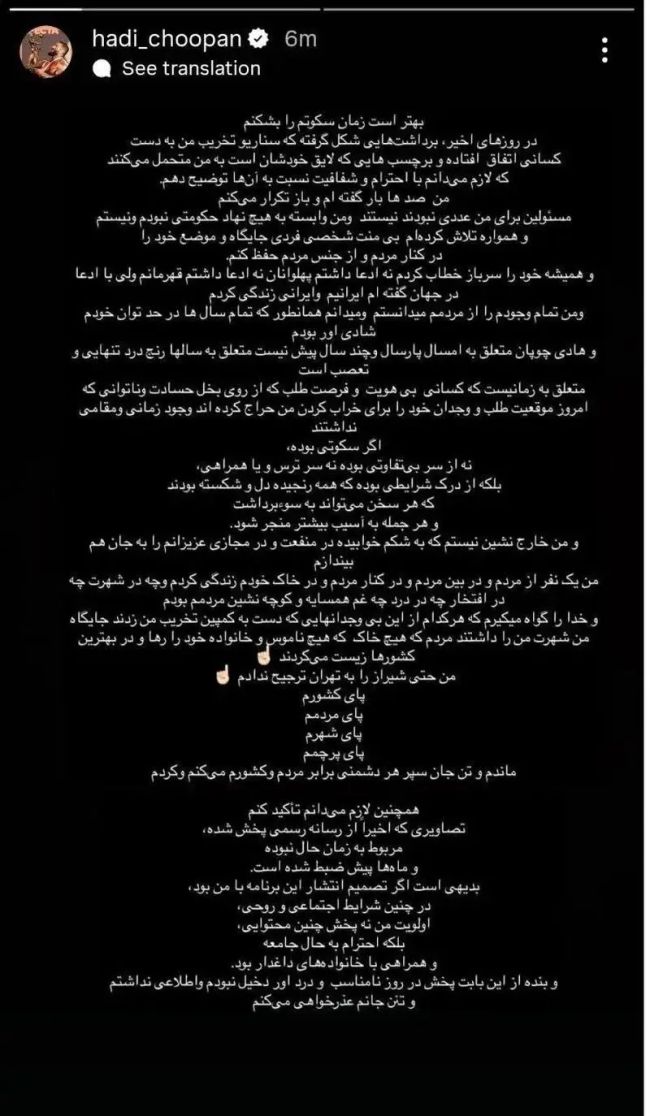 هادی چوپان، دو استوری طولانی منتشر و توضیحاتی درباره اتفاقات چند روز اخیر ارائه کرد.بسیاری از منتقدان بر این باورند که هادی چوپان نمونه بارز ورزشکاری است که در دوراهی میان «شرافت اجتماعی» و «منفعت شخصی»، مسیر دوم را برگزید.