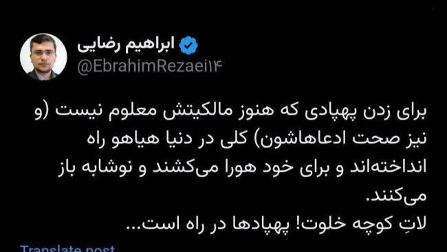 پهپاد ایرانیابراهیم رضایی، سخنگوی کمیسیون امنیت ملی، در حساب کاربری خود در شبکه اجتماعی ایکس نوشت:برای زدن پهپادی که مالکیتش معلوم نیست (و نیز صحت ادعاهاشون) کلی در دنیا هیاهو راه انداختهاند و برای خود هورا میکشند و نوشابه باز میکنند. لاتِ کوچه خلوت! پهپادها در راه است...