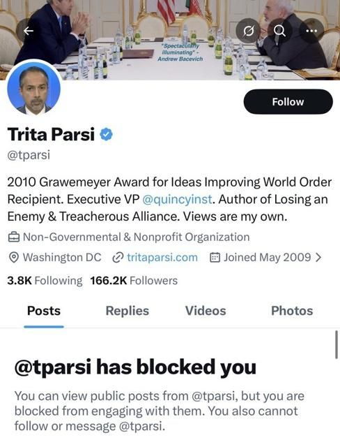 مورد نخست مربوط به تریتا پارسی معاون اجرایی «مؤسسه کوئینسی» مربوط میشود؛ تشکیلاتی که از سیاست خارجی انزواگرایانه آمریکا حمایت میکند. پارسی پیشتر بنیانگذار و رئیس «شورای ملی ایرانیان آمریکا» (نایاک) بود؛ سازمانی که از سیاستی نرمتر از سوی آمریکا در قبال حکومت تهران دفاع میکند.
