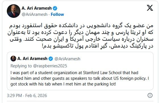 دانشجویی که با او گفتگو میکرد پرسید: «منظورتان همان تریتا پارسی است، درست است؟»