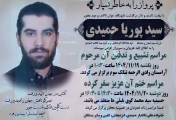 ایران اینترنشنال: مردی در شهر بندری بوشهر در جنوب ایران، پیش از خودکشی، ویدئویی به زبان انگلیسی منتشر کرد و از دونالد ترامپ، رئیس جمهور آمریکا و دولتهای غربی خواست از هرگونه معامله با دولت حاکم بر ایران خودداری کنند.نام این جوان سید پوریا حمیدی ذکر شده است و امروز یکشنبه 19 بهمن مراسم تدفین وی برگزار شده است. ویدیوی ذکر شده به نظر میرسد روز پنجشنبه 16 بهمن ضبط و منتشر شده است.