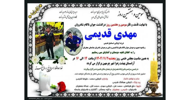 مهدی قدیمی سهماه بود که سربازی را تمام کرده بود و در یک مکانیکی در چرمهین کار میکرد***نامش را بگو؛ مهدی قدیمی، خانواده بالای سر پیکرش تا صبح نگهبانی دادند