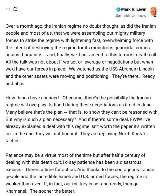 لوین در پایان با اشاره به «شجاعت مردم ایران» و «توان نظامی فوقالعاده ایالات متحده و اسرائیل» تاکید کرد حکومت ایران در ضعیفترین موقعیت خود قرار دارد و نباید اقدام علیه آن بیش از این به تعویق بیفتد. او نوشت اگر ارتش آمریکا واقعاً آماده و مجهز است، اقدام باید «هرچه زودتر» انجام شود.