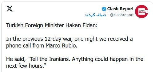 یورونیوز: هاکان فیدان، وزیر خارجه ترکیه در یک گفتگوی تلویزیونی در «سیانان» ترکیه گفت که مارکو روبیو، وزیر خارجه آمریکا پیش از جنگ ۱۲ روزه و حملات اسرائیل با او تماس گرفته و گفته است که به ایران اطلاع دهد «تا چند ساعت آینده هر اتفاقی میتواند بیفتد.»آقای فیدان گفت: «قبل از جنگ ۱۲ روزه، یک شب مارکو روبیو با من تماس گرفت و گفت: به ایرانیها اتفاق بده که طی چند ساعت آینده هر اتفاقی میتواند بیفتد.»