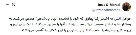 «چرا در رستوران شما عکس شاهنشاه و پرچم شیرخورشید نیست؟ باید همین الان این کار را بکنید!» pic.twitter.com/P2Ada5JxJj