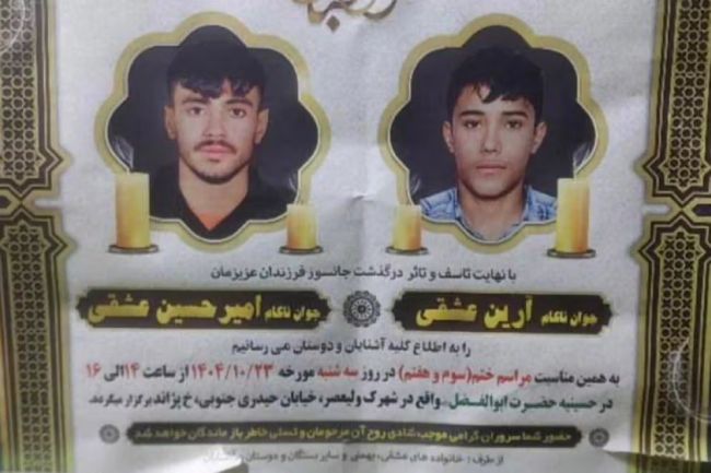 از راست به چپ: علی جاوید و شیوا جاویددو برادر نوجوان؛ امیرحسین و آرین عشقیامیرحسین عشقی، ۱۹ ساله، و برادرش آرین عشقی، ۱۴ ساله، در اعتراضات ۱۸ دیماه حضور داشتند. امیرحسین در مقابل کلانتری یافتآباد هدف گلوله قرار گرفت و پس از آن نیز دو گلوله دیگر به قلبش شلیک شد.