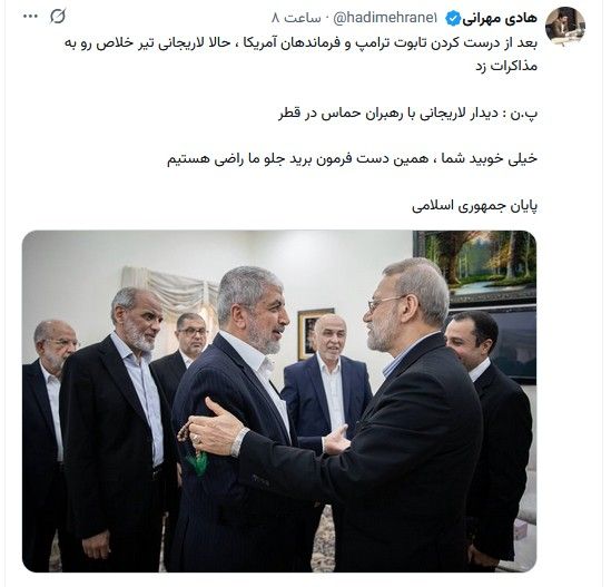 دیدار علی لاریجانی و خالد مشعلعلی لاریجانی، دبیر شورای عالی امنیت ملی ایران، در سفرش به قطر با جمعی از رهبران حماس دیدار کرد، از جمله خالد مشعل، رئیس دفتر سیاسی حماس.آقای لاریجانی در قطر همچنین با سخنگوی حوثیها هم دیدار کرد.