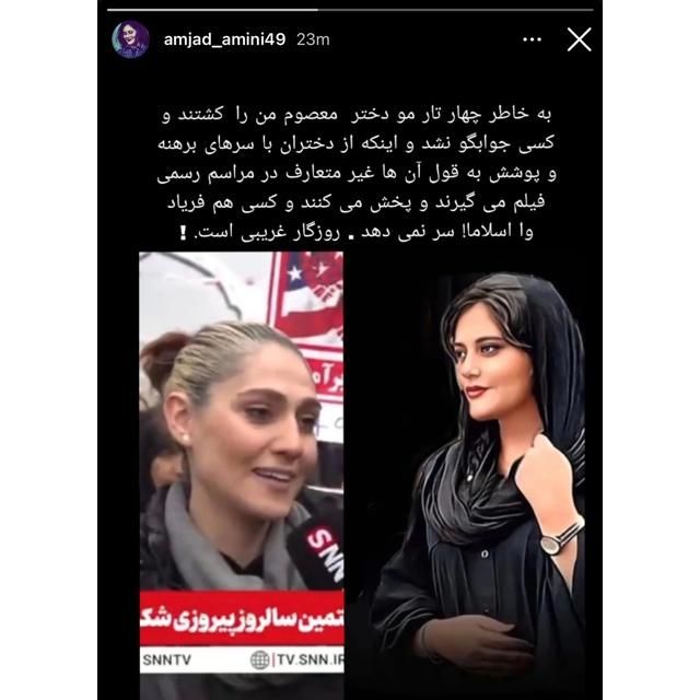 استوری پدر ژینا مهسا امینی در واکنش به حضور بدون حجاب زنان در راهپیمایی ۲۲ بهمن: به خاطر چهار تار مو دختر معصوم من را کشتند و کسی جوابگو نشد و اینکه از دختران با سرهای برهنه و پوشش به قول آنها غیرمتعارف در مراسم رسمی فیلم میگیرند و پخش میکنند و کسی هم فریاد وا اسلاما سر نمیدهد. روزگار غریبی است!